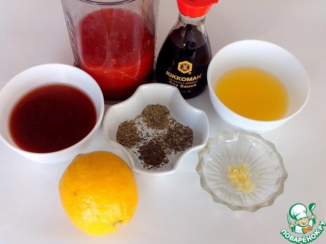 Смешаем в кастрюльке ингредиенты для соуса:разведенную томатную пасту, пюре из консервированных помидоров, апельсиновый сок, соевый соус Kikkoman, имбирь, по щепотке розмарина, тимьяна, базилика, орегано, коричневый сахар. Хорошо перемешиваем. Добавить ( по желанию) сок лимона (регулируем на свой вкус).