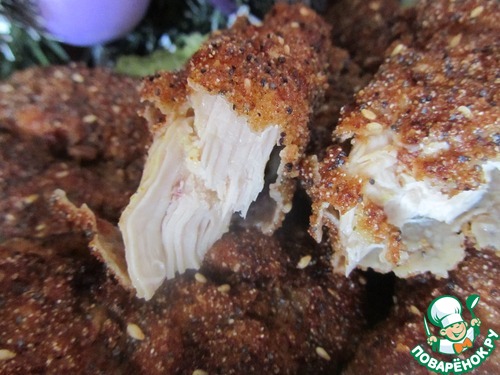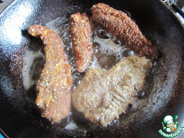 Подготовить льезон: Смешать молоко с яйцами. Подготовить панировочную смесь: В отдельную емкость высыпать муку. В другой емкости перемешать мак, манку, кунжут, панировочные сухари, хмели- сунели и соль.
