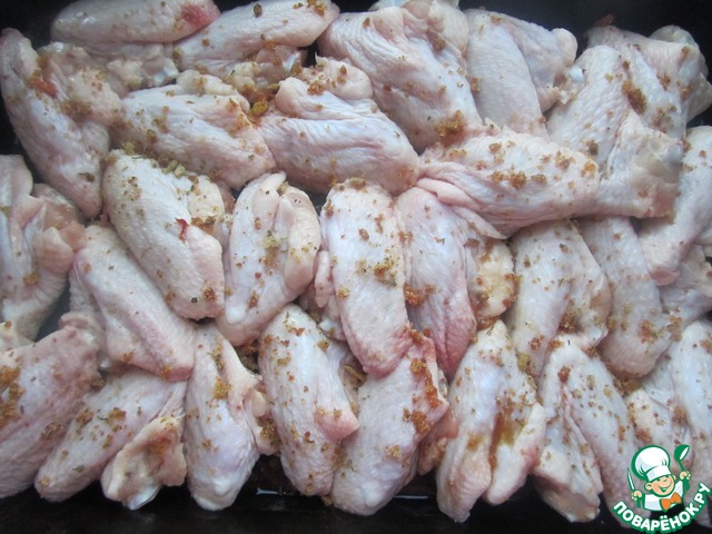 Залить крылья маринадом - глазурью, хорошо смазывая каждое крылышко.