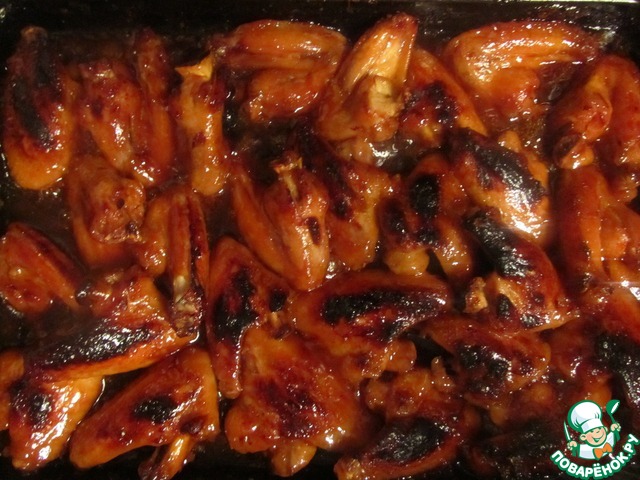 Крылья запекать в духовом шкафу разогретом до 190 градусов 45 минут, до золотистой корочки. Периодически крылья поливать глазурью со дна противня.