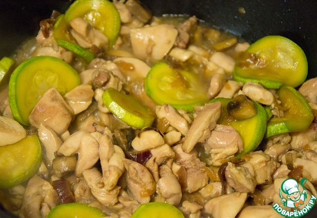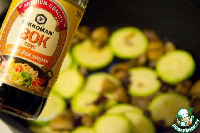 На сковороде на сильном огне обжарить сначала лук, затем добавить грибы, затем цукини и курицу. Добавить соевый соус для жарки.