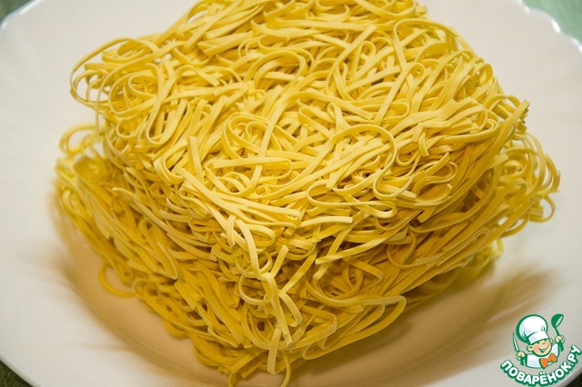Параллельно отварить лапшу (3 минуты). Откинуть на дуршлаг и добавить к курице и овощам. Сразу же добавить яйцо и раздавленный чеснок. Перемешать и готовить до сцепления яйца.