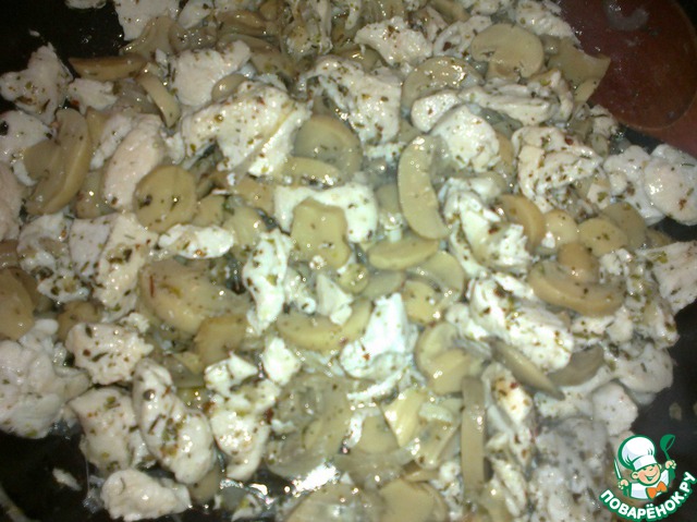 добавьте нарезанные шампиньоны, обжарьте, помешивая, минут 5.
