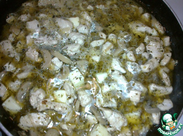добавьте к луку, посолите, поперчите, добавьте любимые специи, обжарьте минут 7,