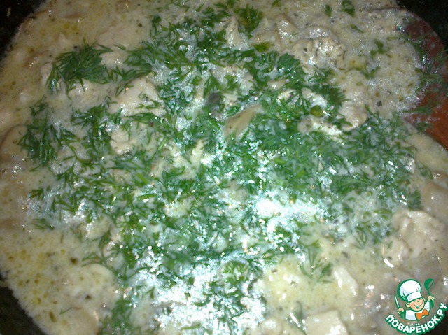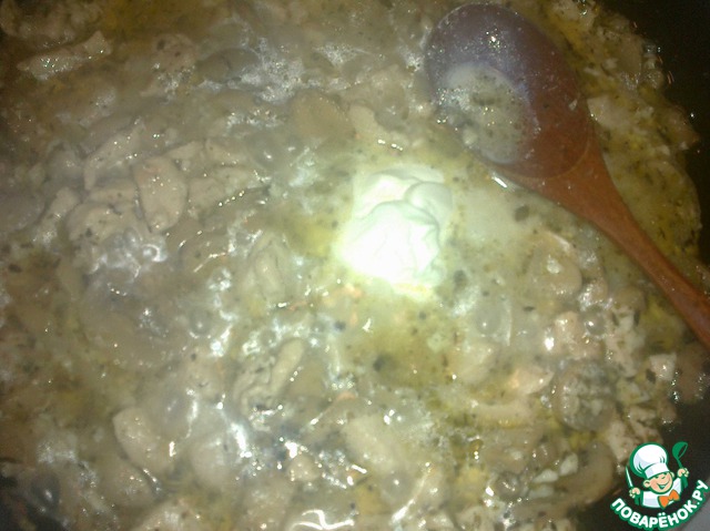 Добавьте 2 ст. л. жирной сметаны, лучше домашней, и горсть тертого сыра (любого), быстро все перемешайте, чтобы сыр не прилип к ложке, потушите минуты 2.