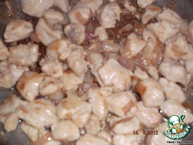 Курицу нарезаем небольшими кусочками, лук произвольно, но не мелко. Слегка обжариваем их в сотейнике на сливочном масле.