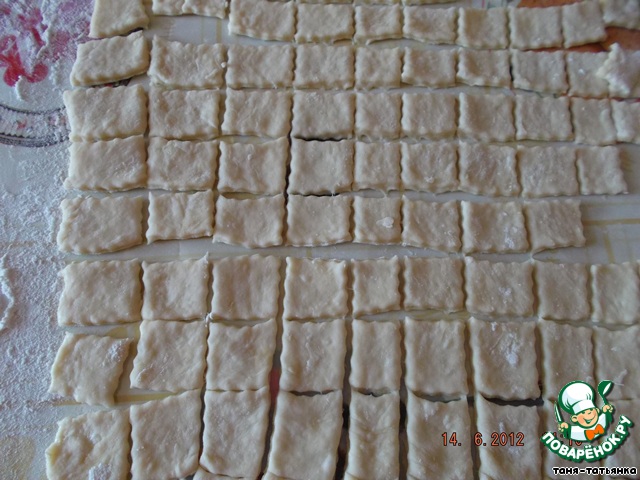 Раскатываем тесто толщиной в 5 мм и нарезаем квадратами 1,5*1,5 см.