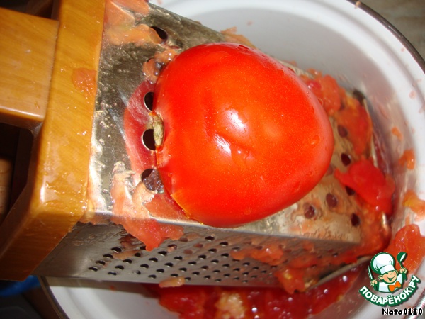 Помидоры разрезаем пополам и натираем на крупной тёрке.