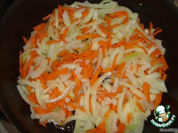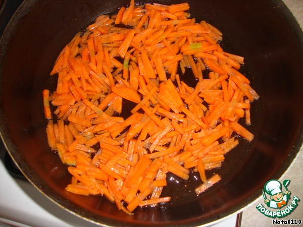 Тем временем готовим соус. На сковороде обжариваем морковь минуты 3.