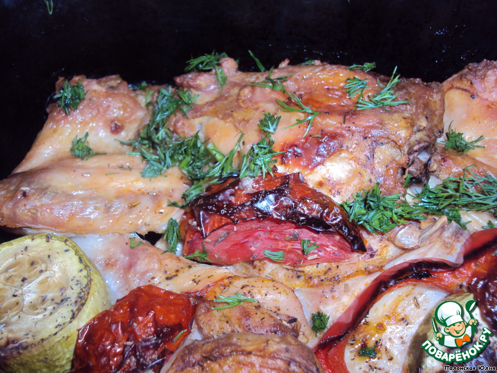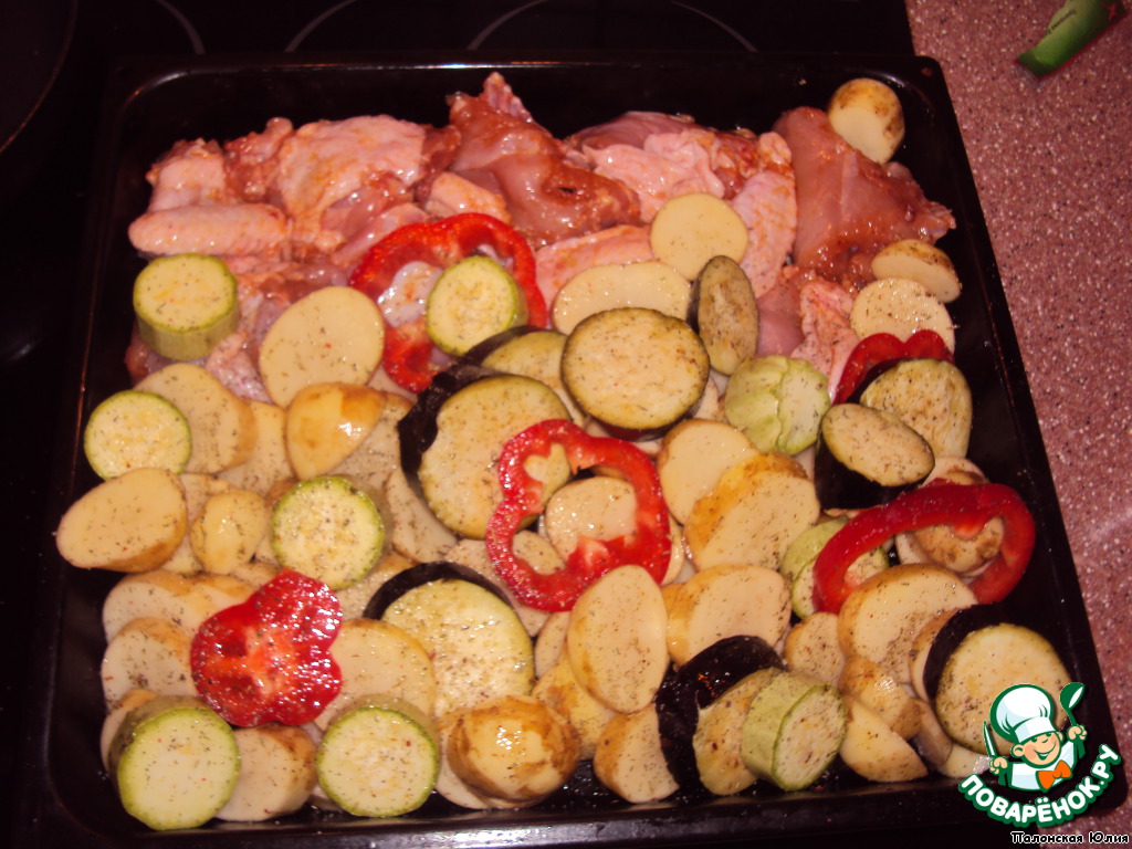 Затем режу курочку на куски, обмазываю специям и солью. Выкладываю на противень. Дальше овощи (овощи кладу по типу "черепицы" )