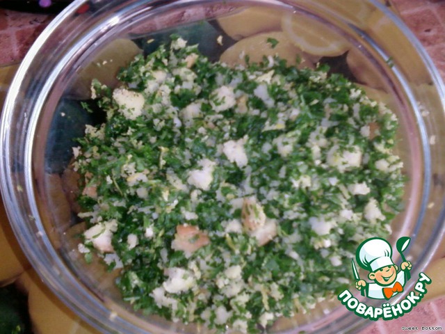 Цедру, зелень, хлеб и чеснок измельчить в блендере.