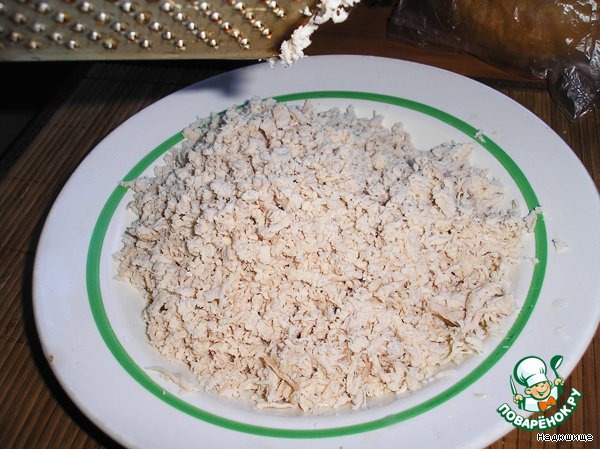 Отвариваем два больших куриных филе. Трем на терке. Это совсем не сложно. Или мелем на мясорубке.
