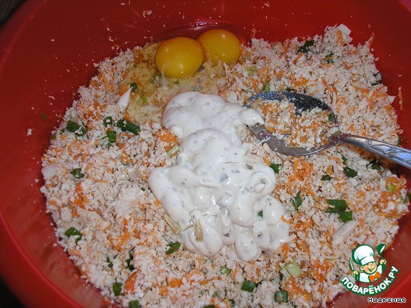 Теперь вбиваем 3 яйца в фарш, добавляем соус, или майонез, или сметану. Добавляем немного лимонного сока. Размешиваем.
