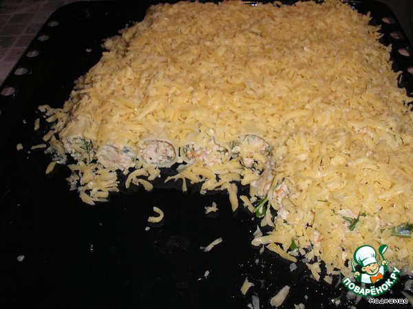 Фаршируем каннеллони. Трем сыр на крупной терке и посыпаем сложенные трубочки на противне, смазанном растительным маслом. Запекаем в духовке около 15 минут.