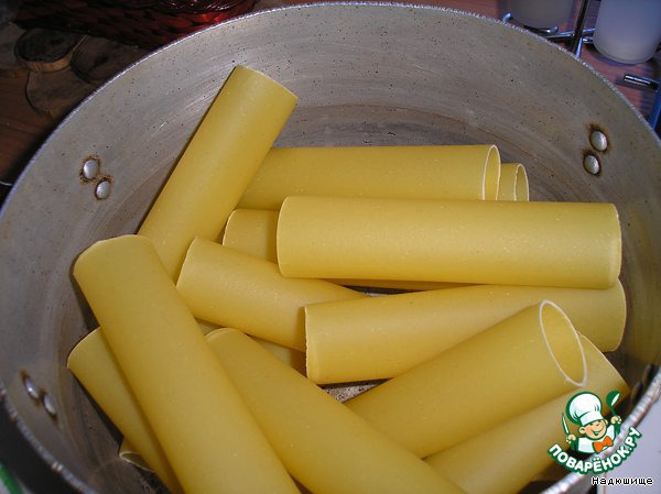 Кладем каннеллони в глубокую посуду и заливаем их горячей водой, пока чуть не размягчаться.