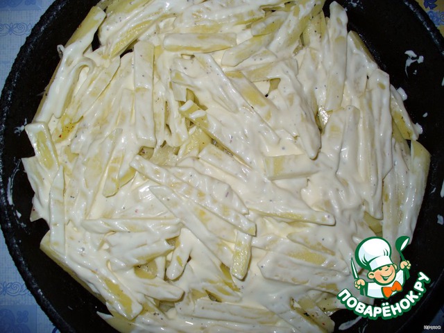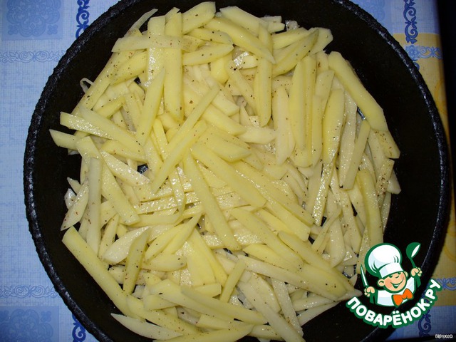Сковороду (или форму) смазать маслом. Картофель очистить и нарезать соломкой, посолить, поперчить и сложить в сковороду.
