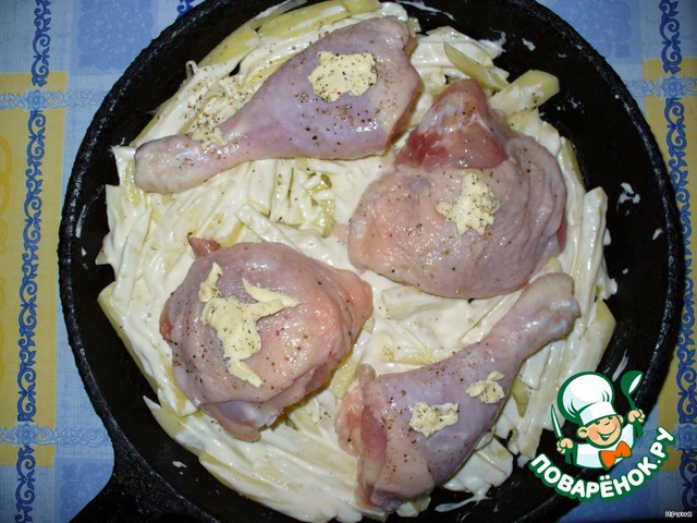 Окорочка (голени) вымыть, обсушить, посолить, поперчить и положить сверху картошки. На каждый кусок курицы положить по небольшому кусочку масла. Запекать в духовке при 200 градусах 1 час.