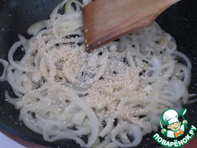 Как только лук станет мягким, добавляем кунжут