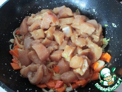 Лук с морковью почти готовы, вводим куриное филе, обжариваем