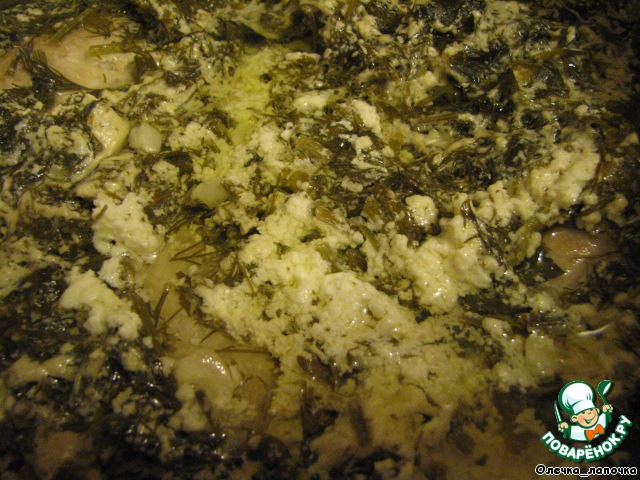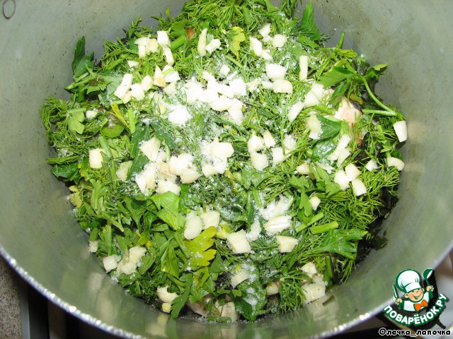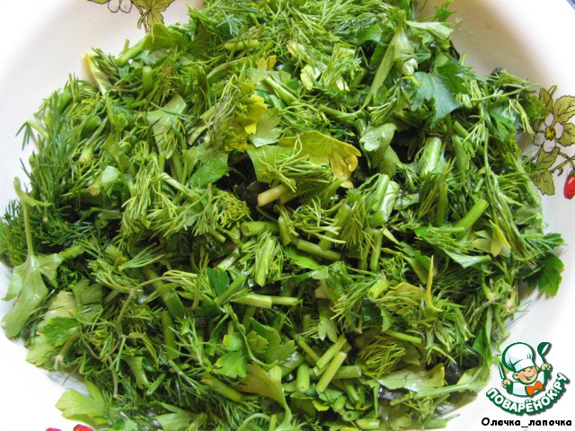 Зелень порубить (тоже не мелко) вместе со стеблями. Я еще порубила зелень кинзы, но это по вкусу.