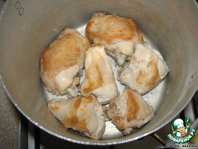 Повторить все в том же порядке. Вылить масло, в котором жарилась курочка и добавить воды так, чтобы она не покрыла курицу до конца.