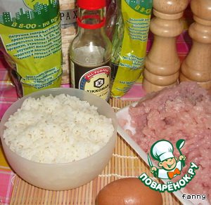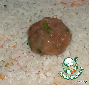Рис разложить на плоском блюде. Из фарша сформовать шарики величиной с грецкий орех и запанировать в рисе, смешанном с крахмалом.