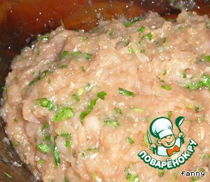 В фарш добавить яйцо, зеленый лук, кинзу, соль, перец, соевый соус и тщательно перемешать.