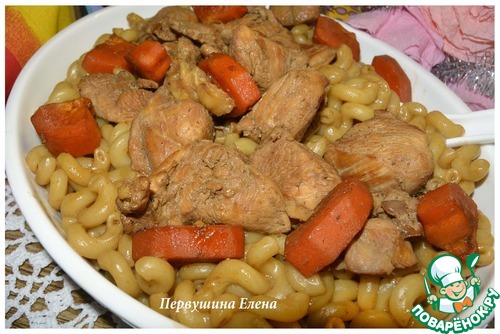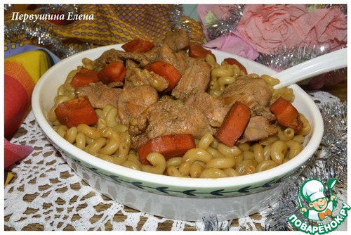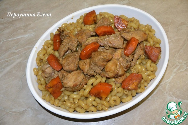 Мясо с морковью выложить на макароны и