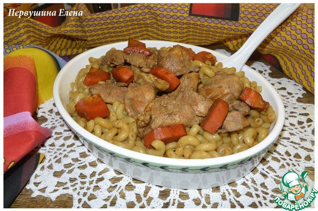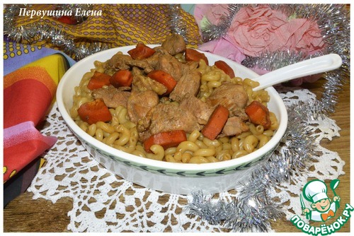 Жидкость, в которой тушилось мясо, смешать с макаронами.