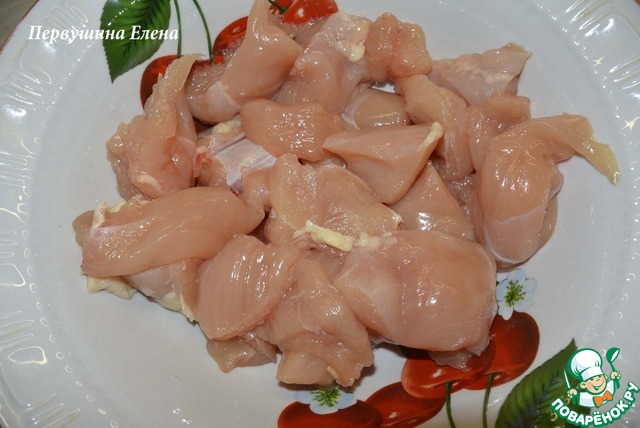 Филе нарезать кусочками примерно 3х3см, толщиной 1-1,5см.