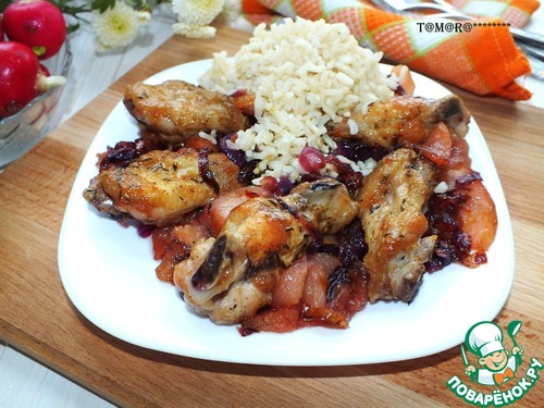 Выкладываем на тарелку карамелизированный лук с яблоками, на него готовый рис и крылышки. Приятного аппетита!