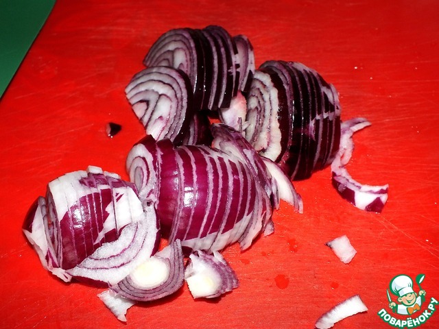 Пока жарятся крылья лук почистим и нарежем полукольцами (можно взять белый лук)