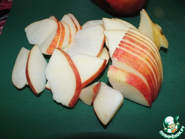 На сковороду, где жарились крылышки, выкладываем лук, чеснок, яблочные дольки, посыпаем сахаром