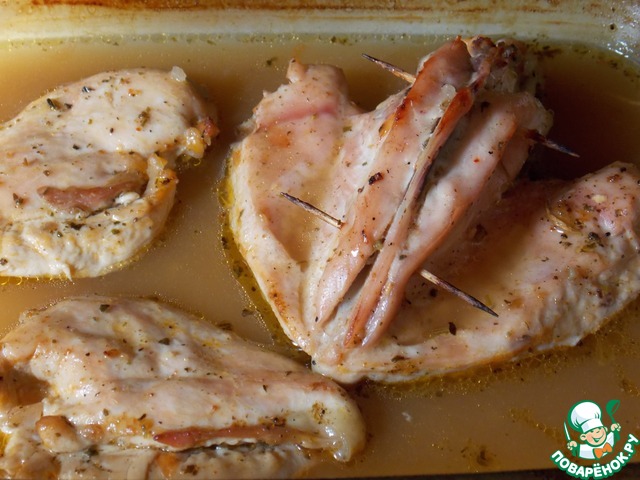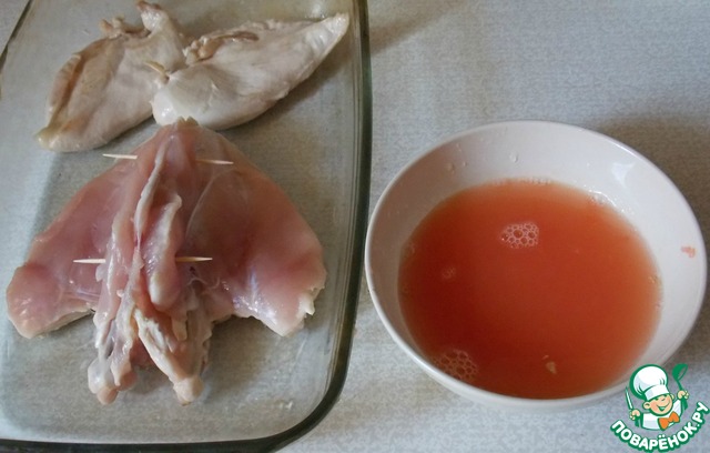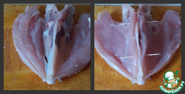 Скажу сразу, что я предпочитаю филе, муж грудку на кости. Поэтому из одной грудки я сделала филе, а вот вторую превратила в такую медузку. Для этого Я от хребта срезаю филе, но не до конца. Отделяю малое филе, поднимаю к хребту и закрепляю зубочистками.