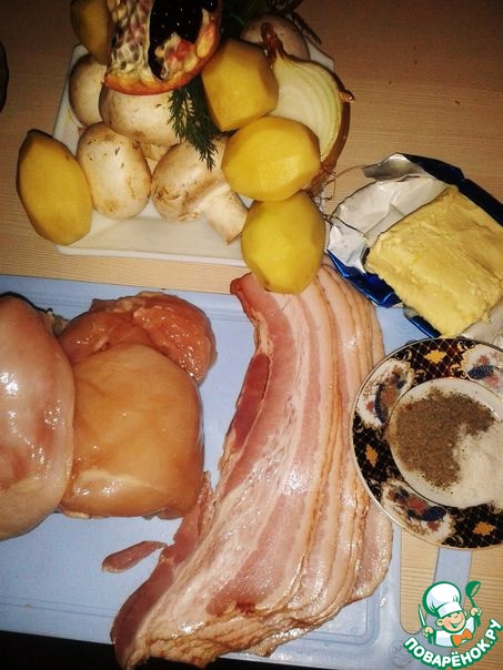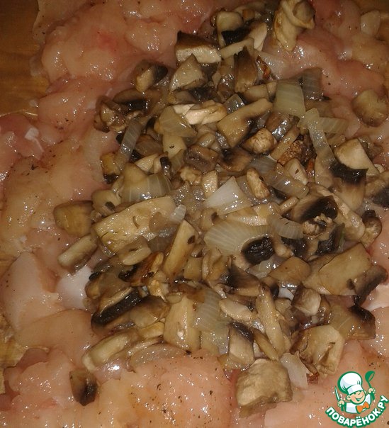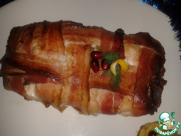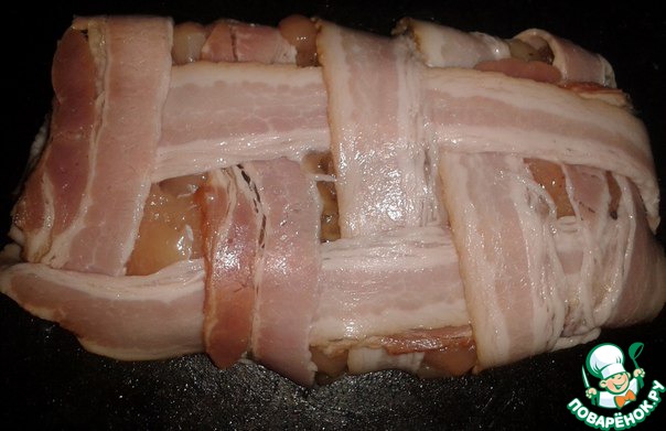 Кусочки филе разложить на пленке, на них положить готовые грибы с луком и свернуть в рулет так, чтобы грибы были полностью закрыты. Поместить подготовленный рулет на коврик из бекона.