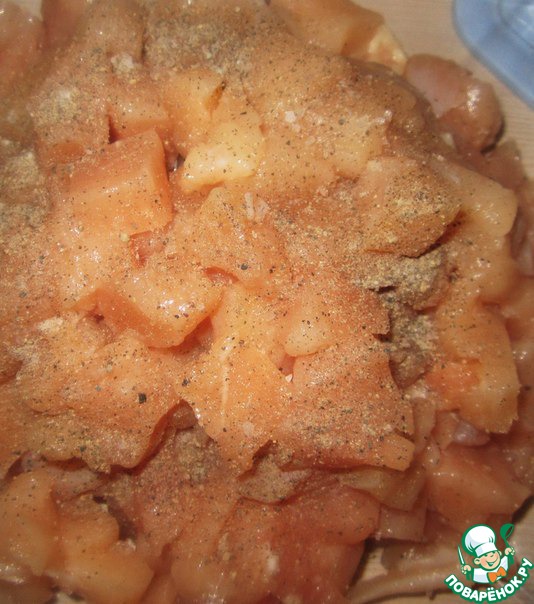Филе курицы нарезать мелкими кусочками, посолить, поперчить