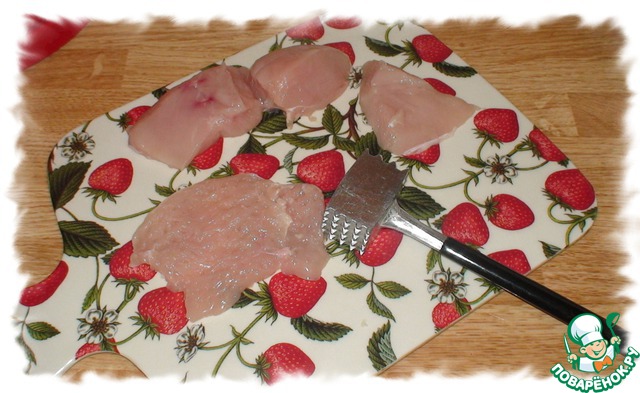 Куриное филе помыть и обсушить. Нарезать на кусочки и отбить каждый с двух сторон. Посолить. У меня получилось из двух штук 10 кусочков.