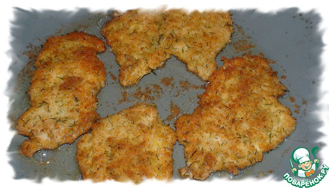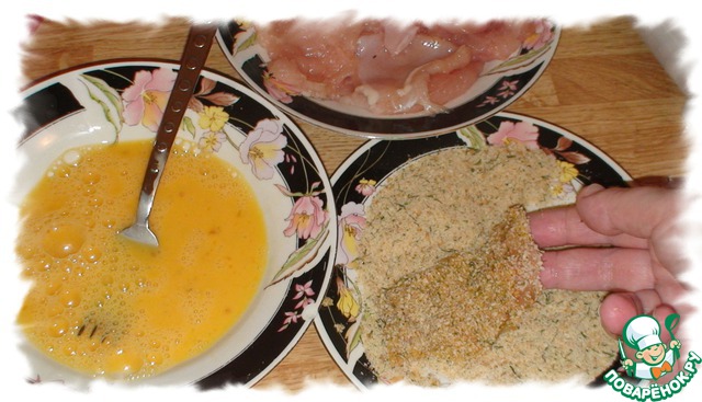 Яйца взбить слегка вилкой. Каждый отбитый кусочек филе обмакнуть в яйцо, затем в панировочные сухари. Можно использовать сухари простые или с разными добавками. У меня были простые, но я добавила в них сухой укроп.