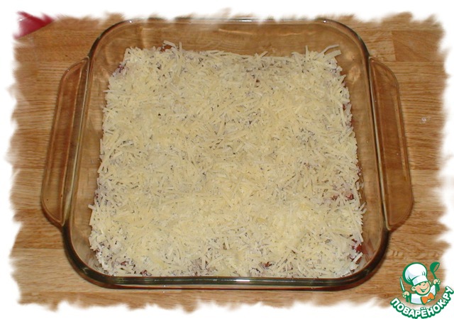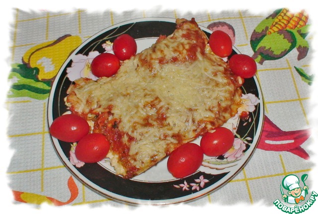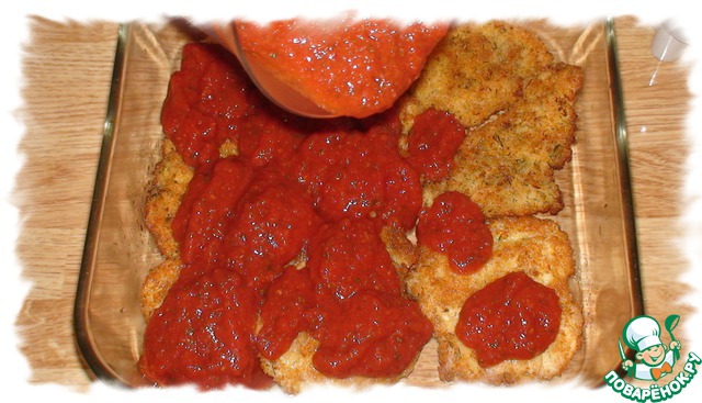 Уложить все обжареные кусочки филе в форму для запекания одним слоем и сверху покрыть томатным соусом. Я использовала соус, который готовлю сама, рецепт здесь http://www.povarenok .ru/recipes/show/560 75/ Mожно взять любой томатный покупной соус.
