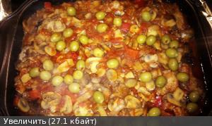 Через 40-45 мин. открываем и добавляем оливки, фаршированные пири-пири, накрываем и ещё на 15 мин.