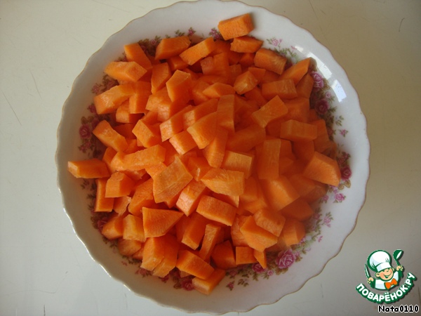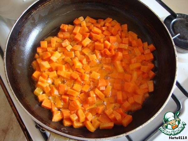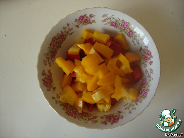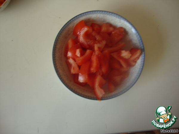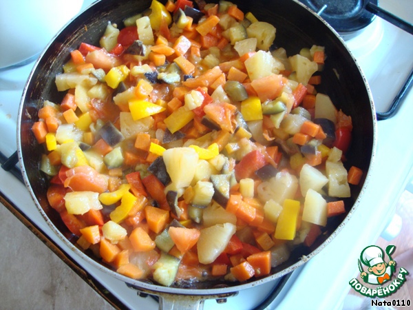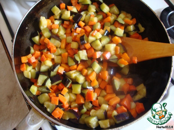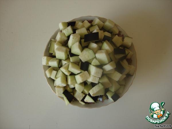 И начинаем готовить начинку: нарезаем кубиками баклажан,