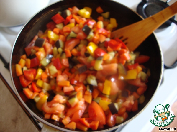 Добавляем туда баклажан и ещё 3 минуты обжариваем.