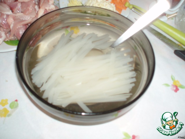 Bо-первых обязательно залить кипятком поломанную рисовую лапшу с полчайной ложкой соли (если забыли, то отварить 3 минутки), пока занимаемся нарезкой и обжаркой, пусть парится))