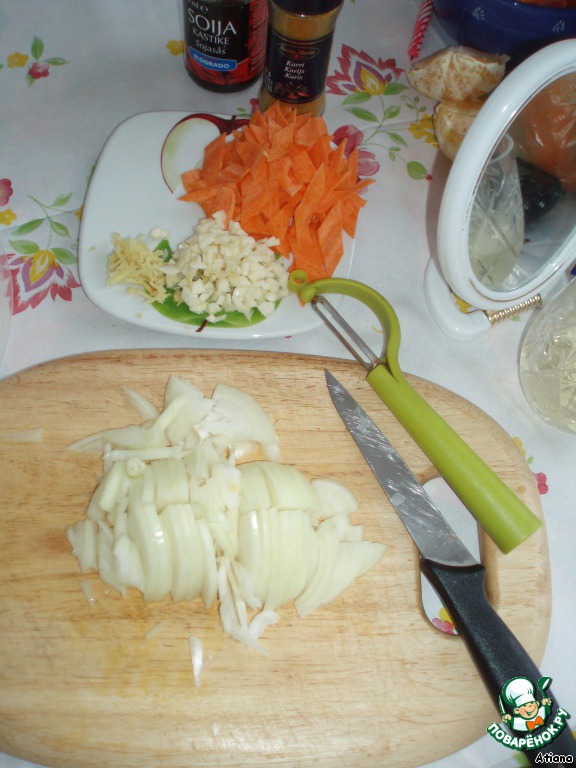 Порезать мелко чеснок, лук на четверть-кольца, мoрковку тонкой соломкой (но мне понравился другой способ: овощечисткой на тонкие пласты и по диагонали - на ромбики))), если добавляете имбирь, то его на мелкой тёрке натереть.