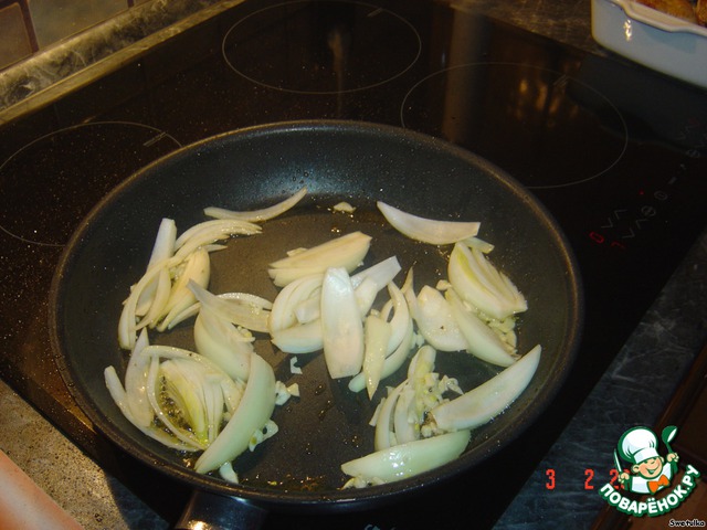 2. Лук обжарить на сковороде, где жарилась курица. Добавить чеснок.