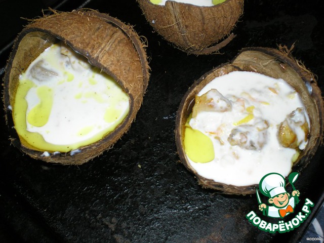 В ядра кокоса положить поджаренное филе, залить соусом и поставить в разогретую духовку до того момента, как соус загустеет.