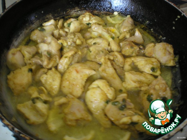 Куриное филе нарезать небольшими кусочками. Залить этой смесью куски курицы. Мариновать 1,5 часа.
