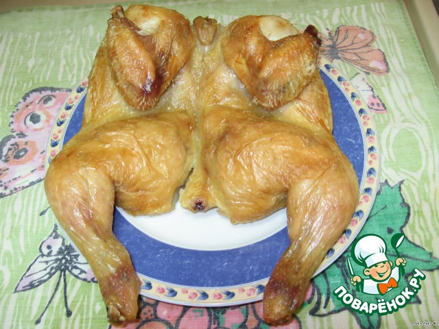 Курицу разрезать по брюшку, распластать, помыть и высушить насухо. Ничем ее не мазать и не посыпать. Положить на сухой противень. Поставить в духовой шкаф на 1 час при 180 гр.