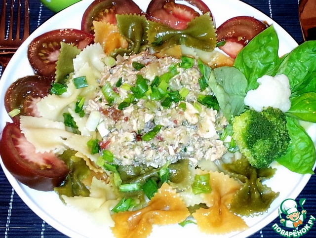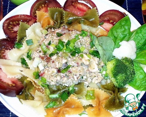 Бантики разложила по тарелкам. В середину положила измельчённые курицу с овощами.