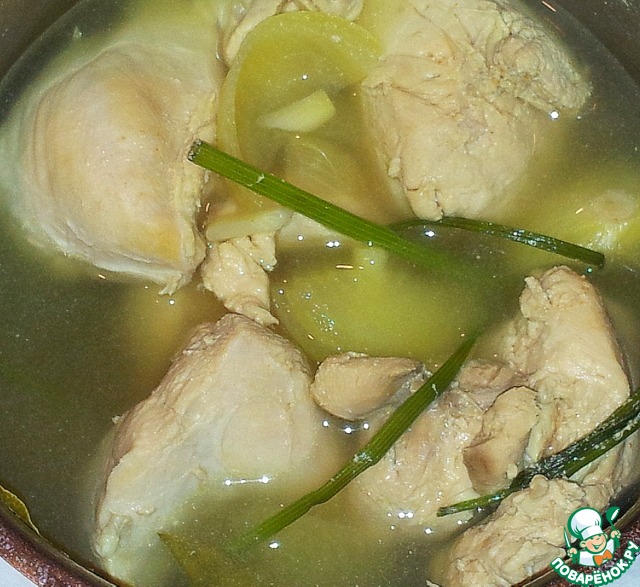 Курицу я варила с репчатым луком, стеблями укропа, лавровым листом в подсоленной воде, чтобы мясо было вкусным и ароматным.